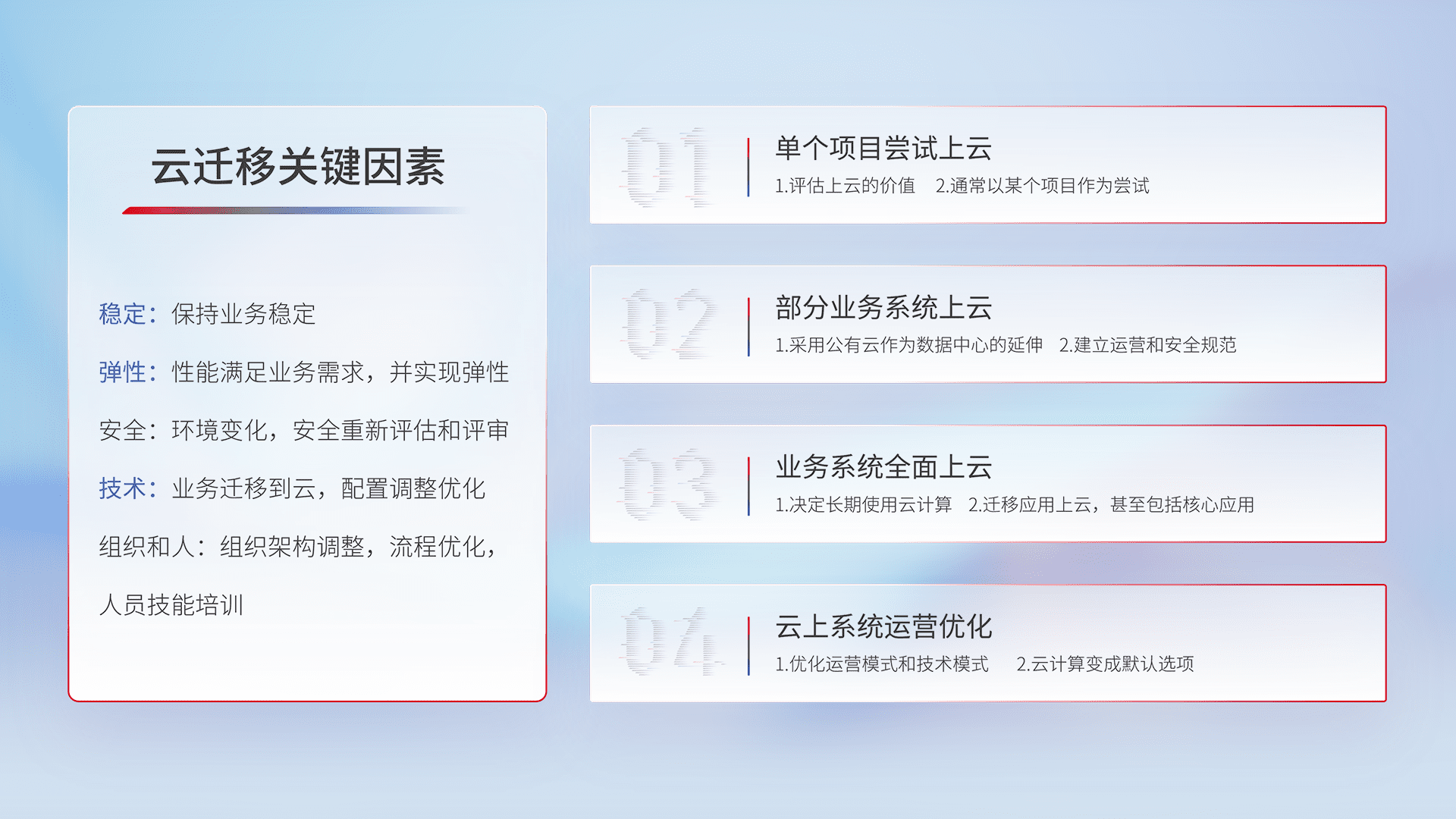 结合实际业务,,从规划设计、、、云平台选型、、、云原生改造、、、、数据迁移、、、、集成交付,,,,迁移全过程为客户识别最佳上云路径,,做好风险识别管理,,,设计网络架构、、、身份权限、、安全审计合规、、、、操作审计、、、日志审计、、、、监控告警策略、、、多站点容灾设计等,,对云上基础设施进行整体规划,,提升IT治理水平,,以满足弹性、、、高可用、、、高性能的需求。。。